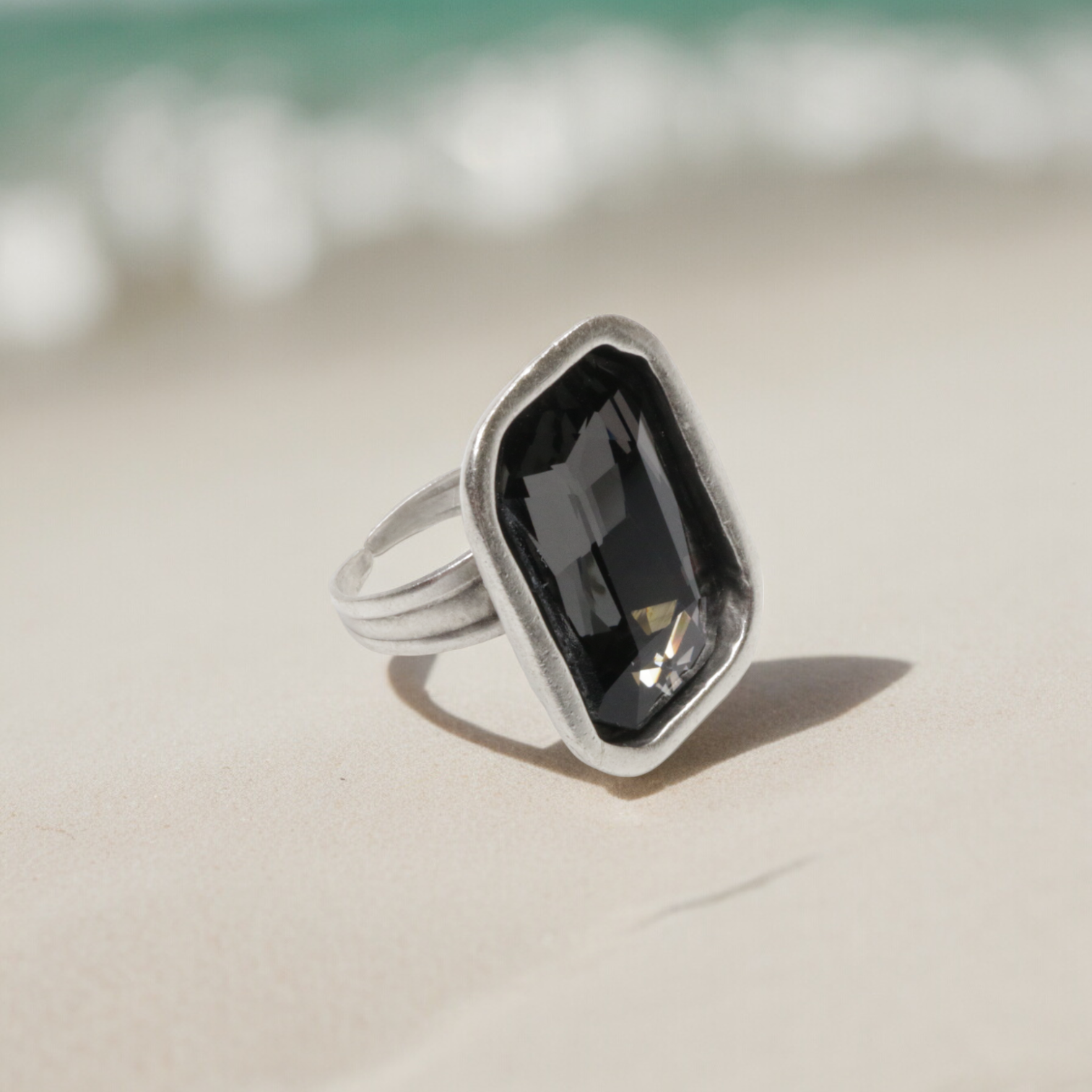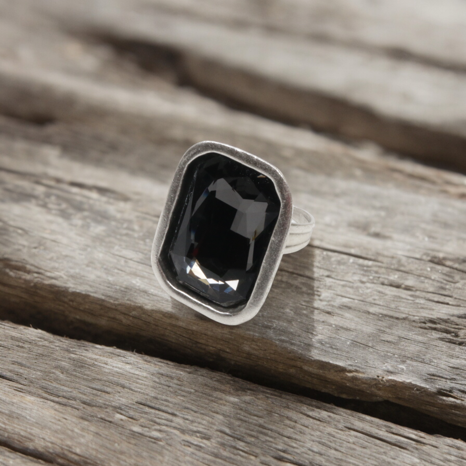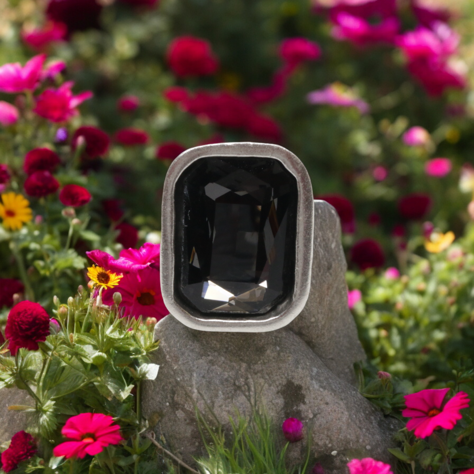 Hand Made Brass Ring with Smokey Gray Crystal plated in 925 Sterling Silver.