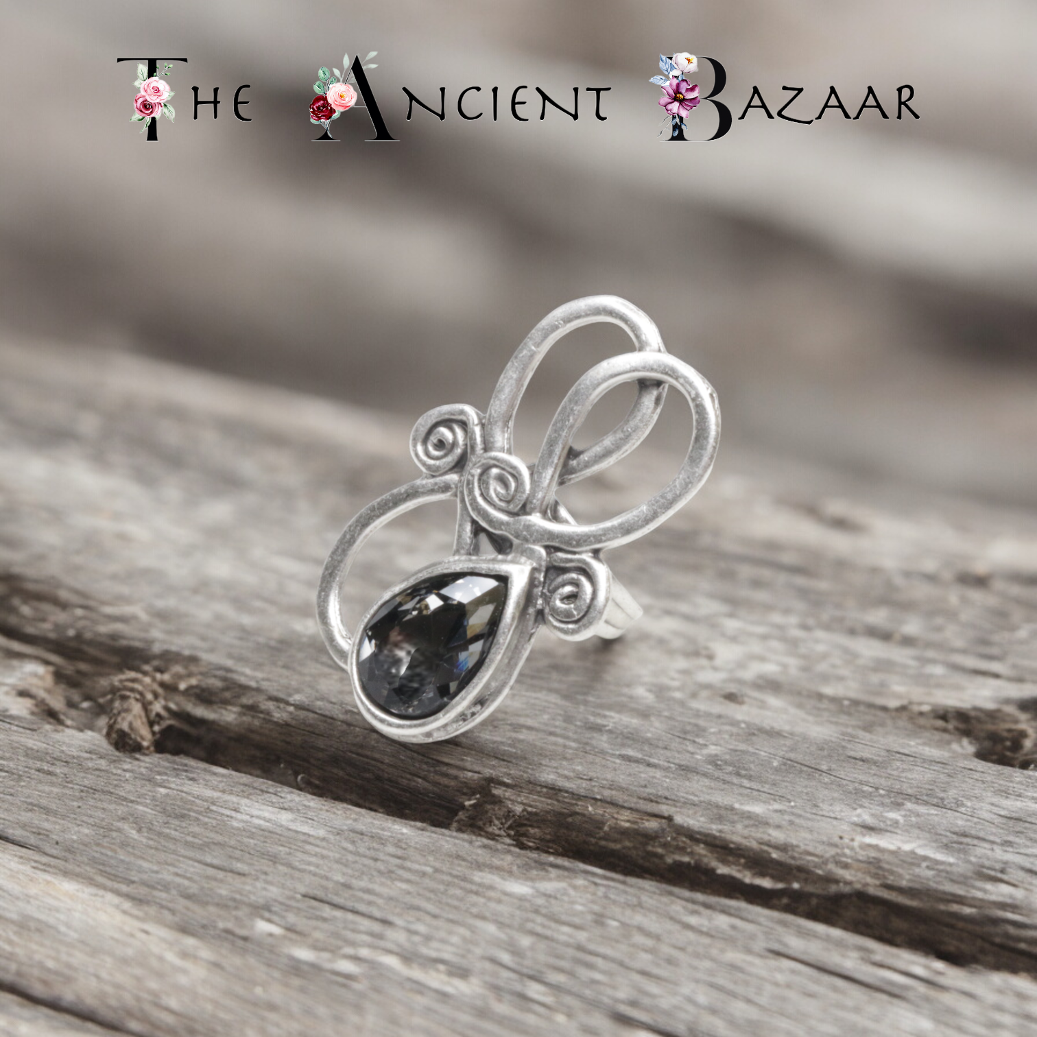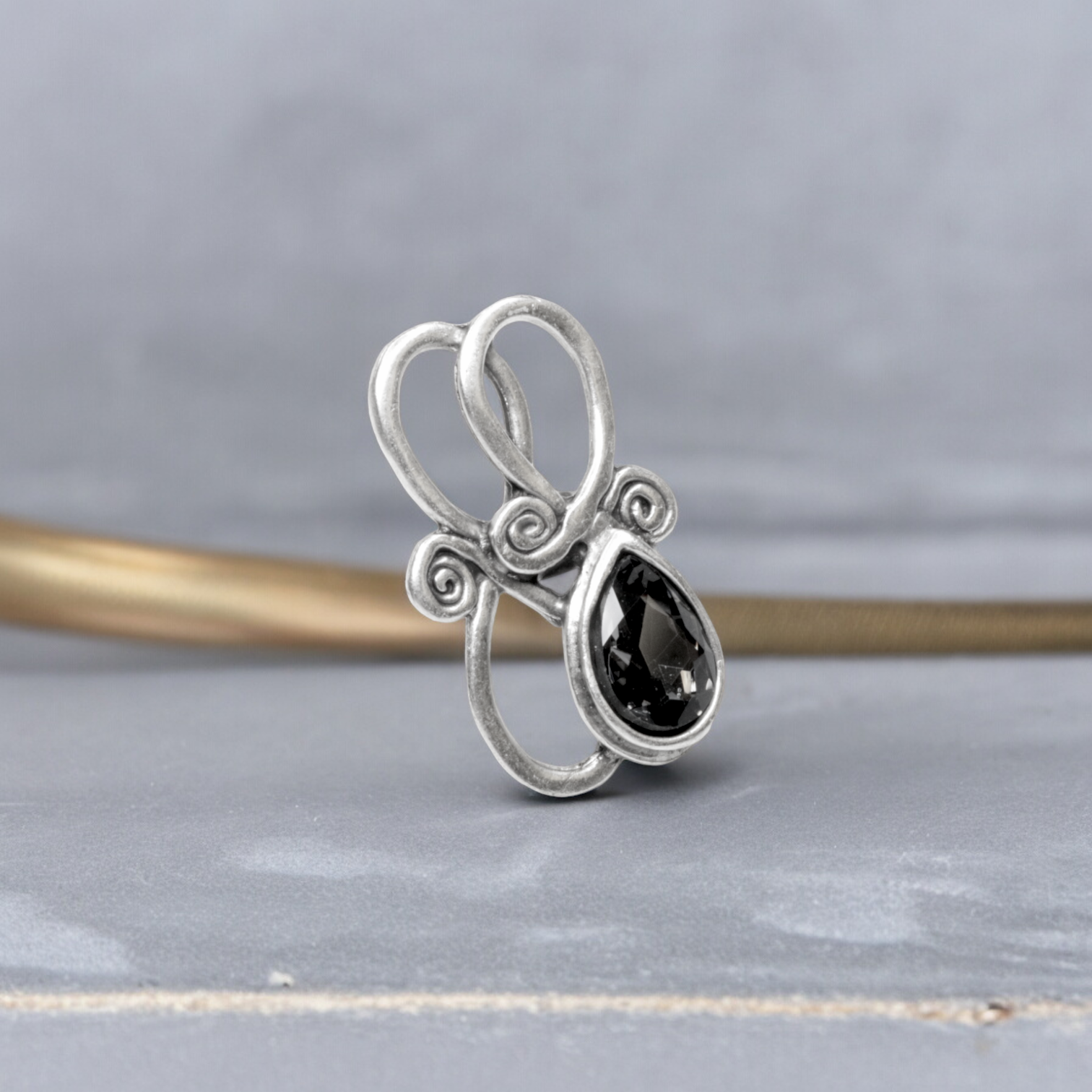 Hand Made Brass Ring with Smokey Gray Crystal plated in 925 Sterling Silver.