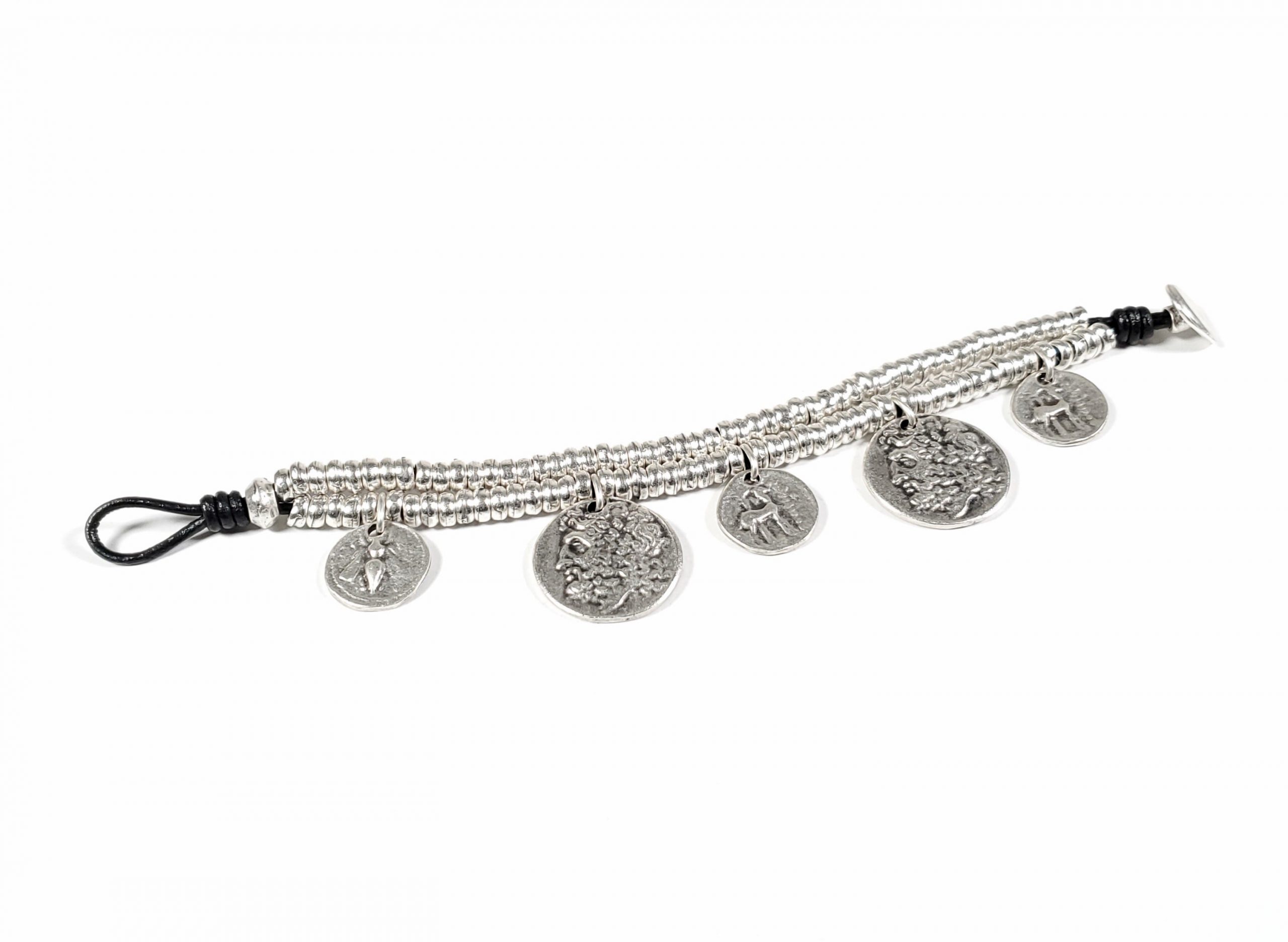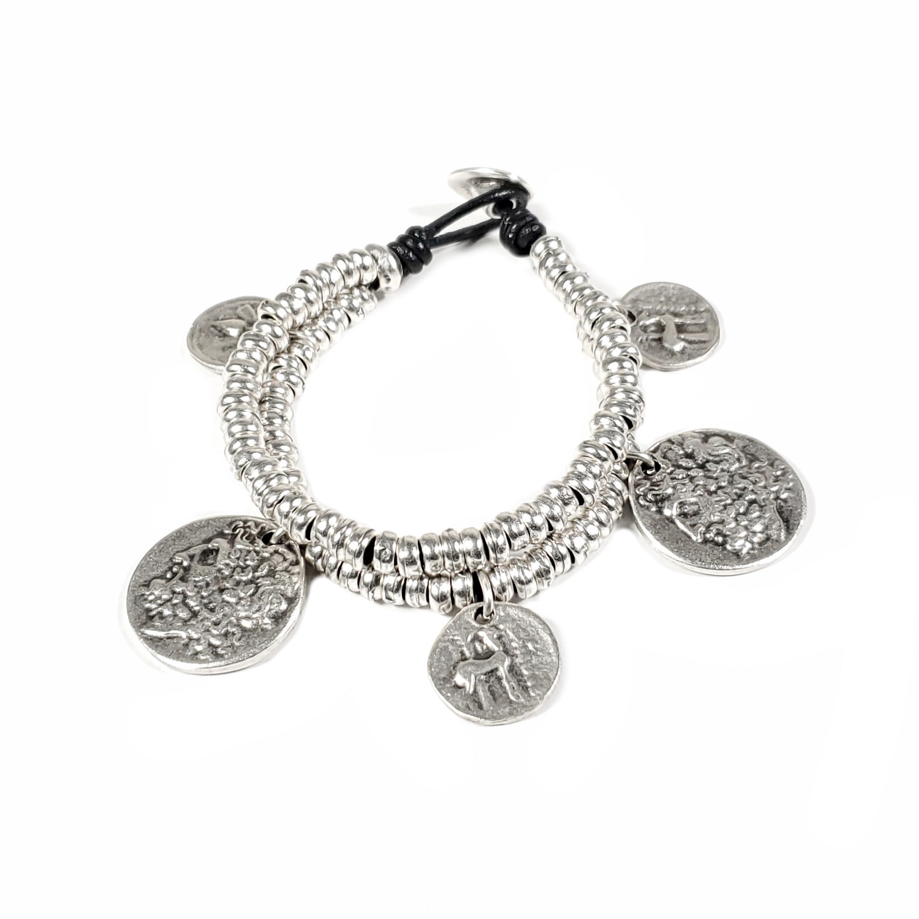 Hand Made Pewter & Leather Boho Coin Bracelet plated in 925 Sterling Silver .