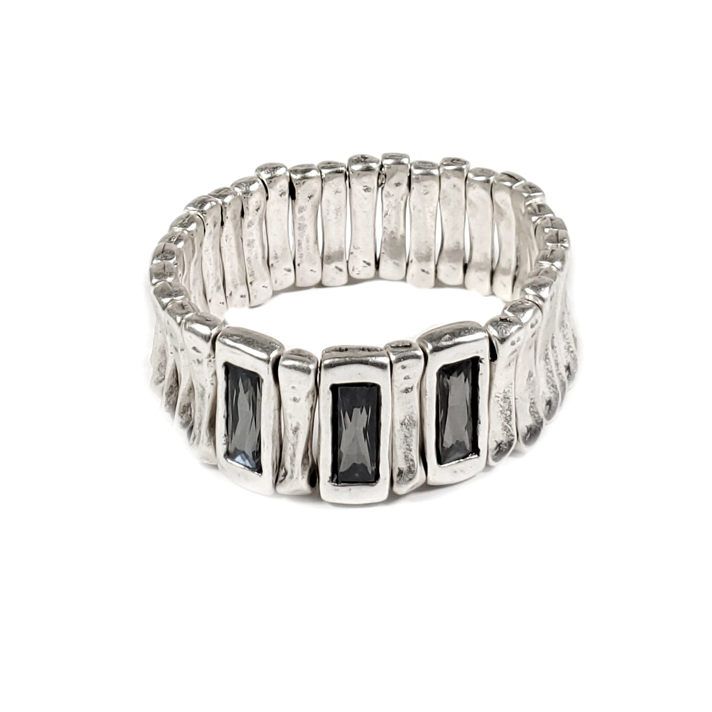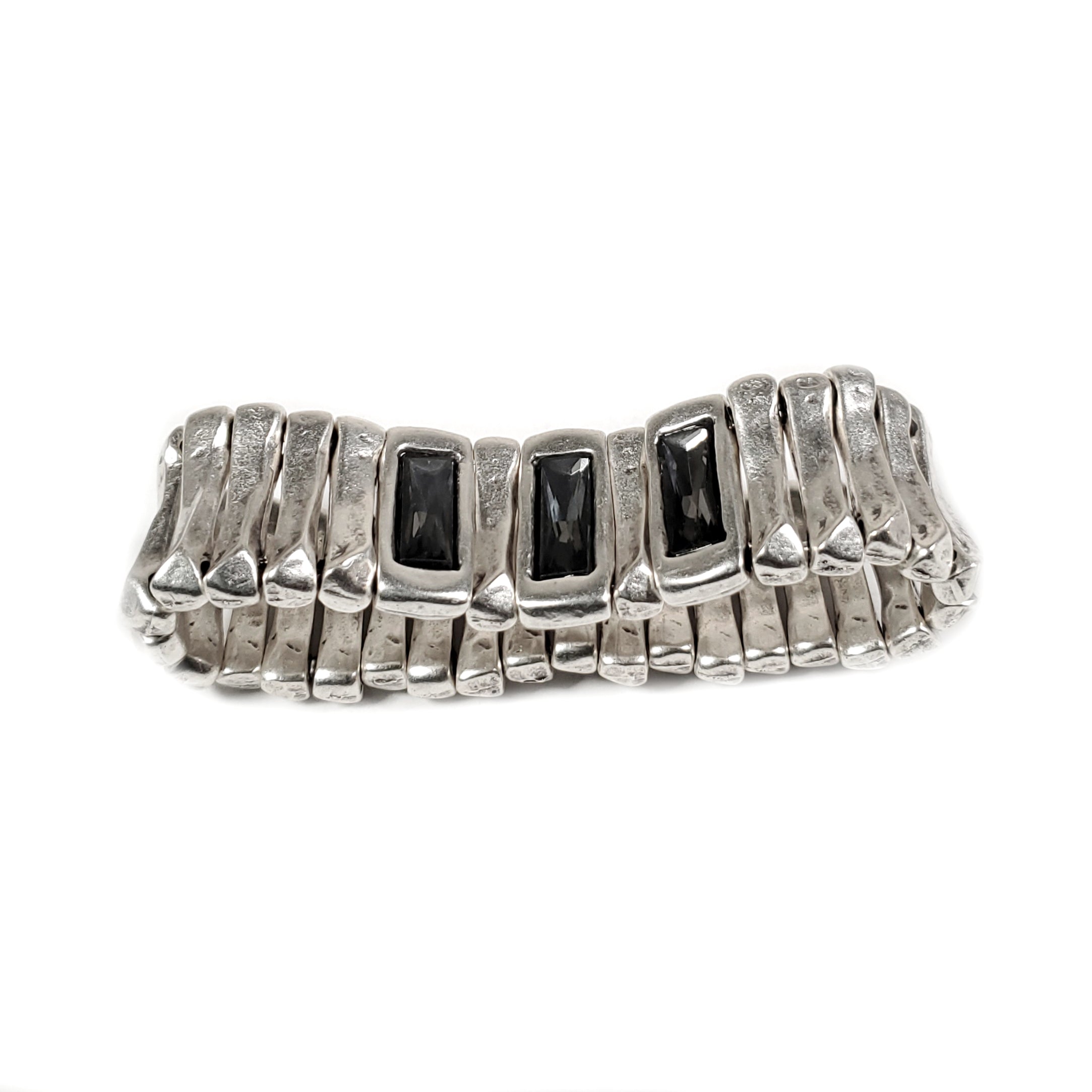 Hand Made Pewter Boho stretch Bracelet plated in 925 Sterling Silver With Smokey Gray Crystals .