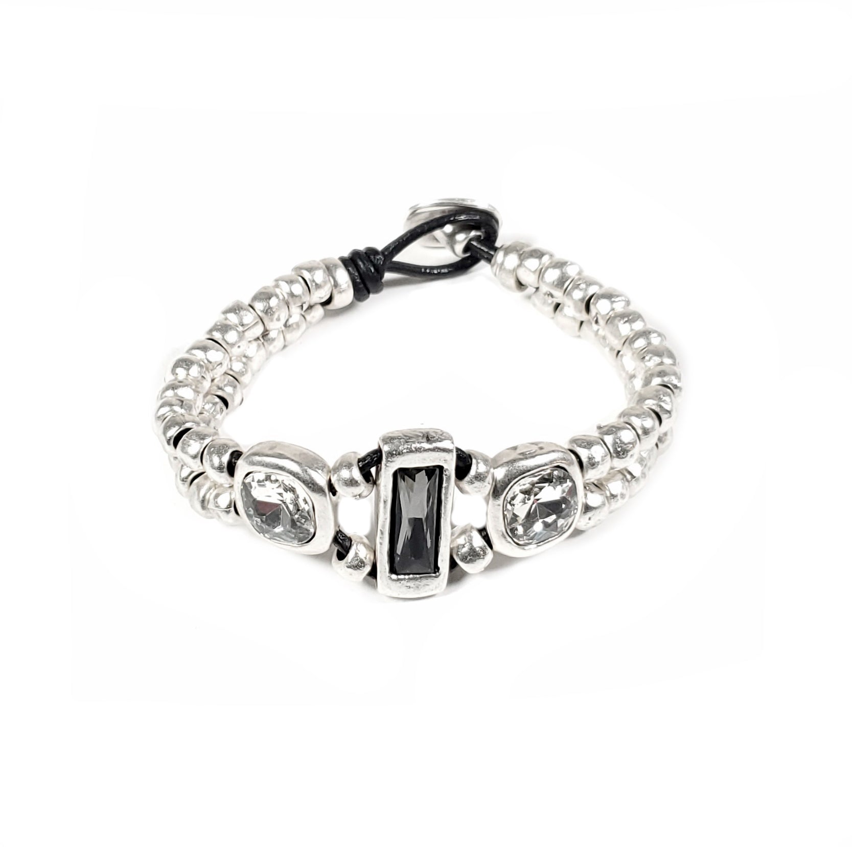 Hand Made Pewter & Leather Boho Bracelet plated in 925 Sterling Silver With Clear & Smokey Gray Crystals .