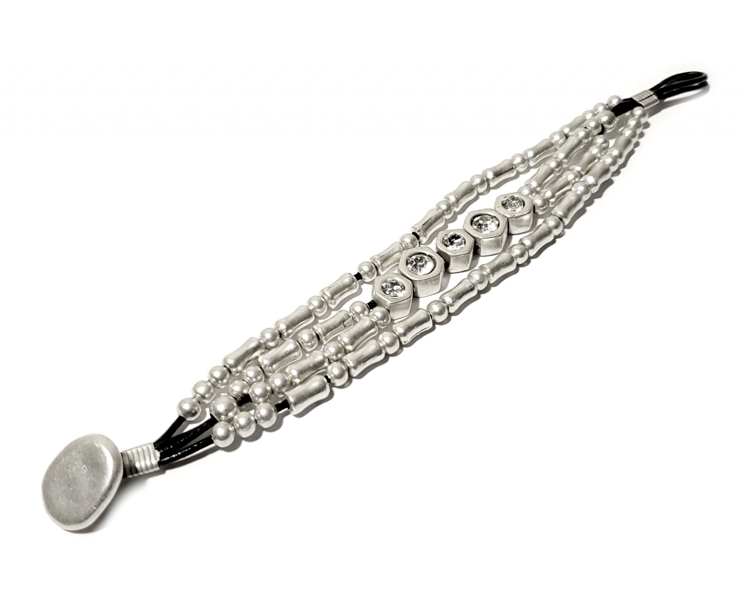 Hand Made Pewter & Leather Boho Bracelet plated in 925 Sterling Silver With Clear Crystals.
