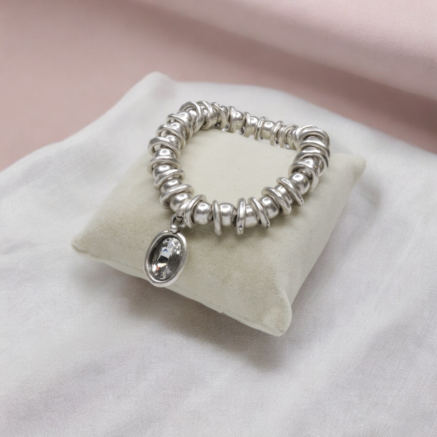 Hand Made Pewter stretch Bracelet plated in 925 Sterling Silver with Clear Crystal .