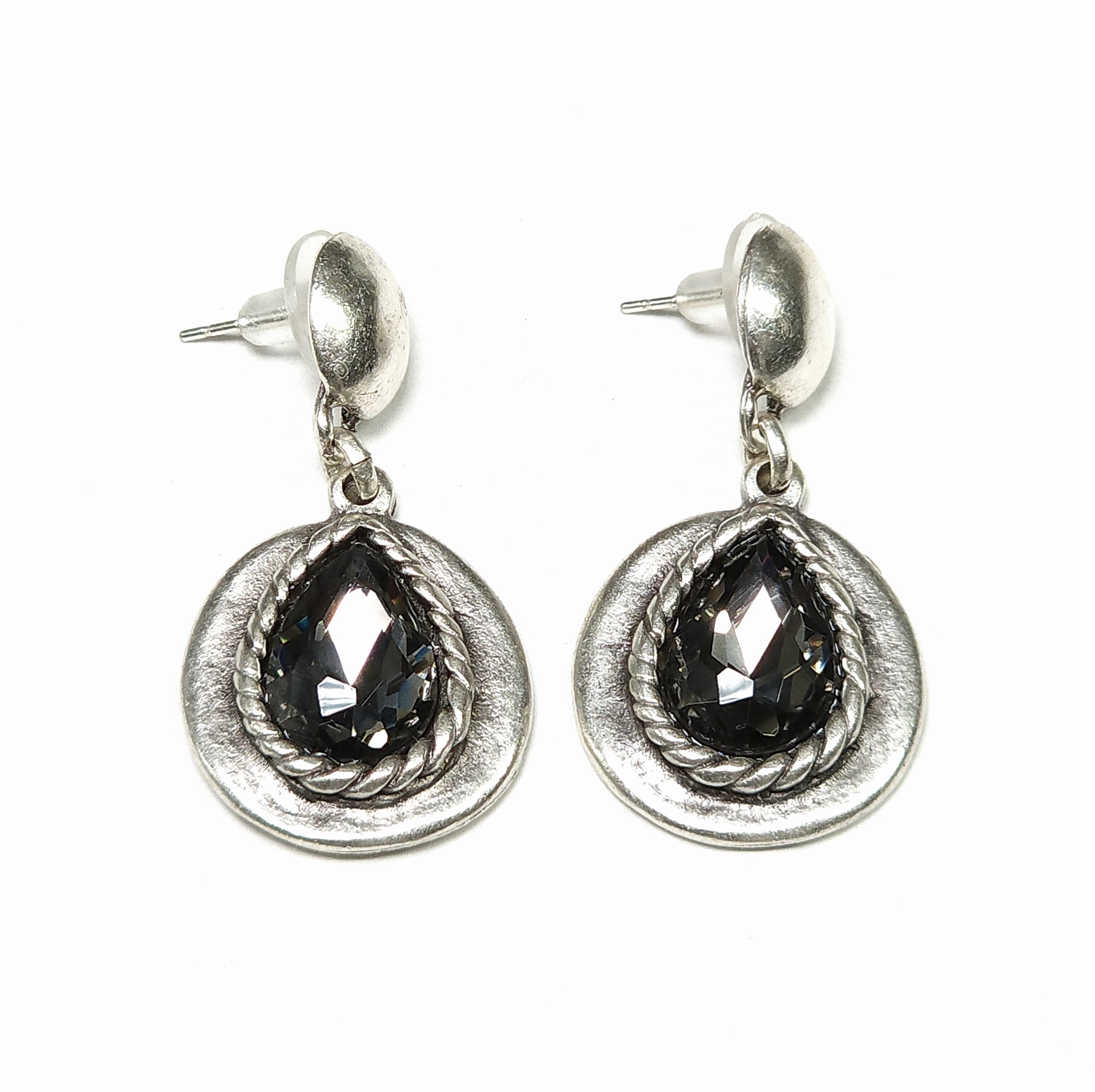 Hand Made Pewter Earrings plated in 925 Silver with smokey Gray crystals.