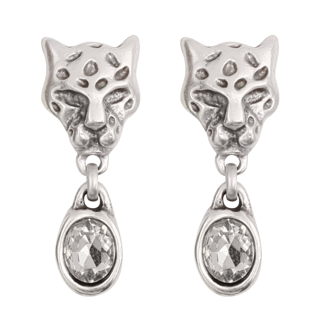 Hand Made Pewter Panther Earrings with Clear Crystals plated in Silver. Hypoallergenic & Nickel free.