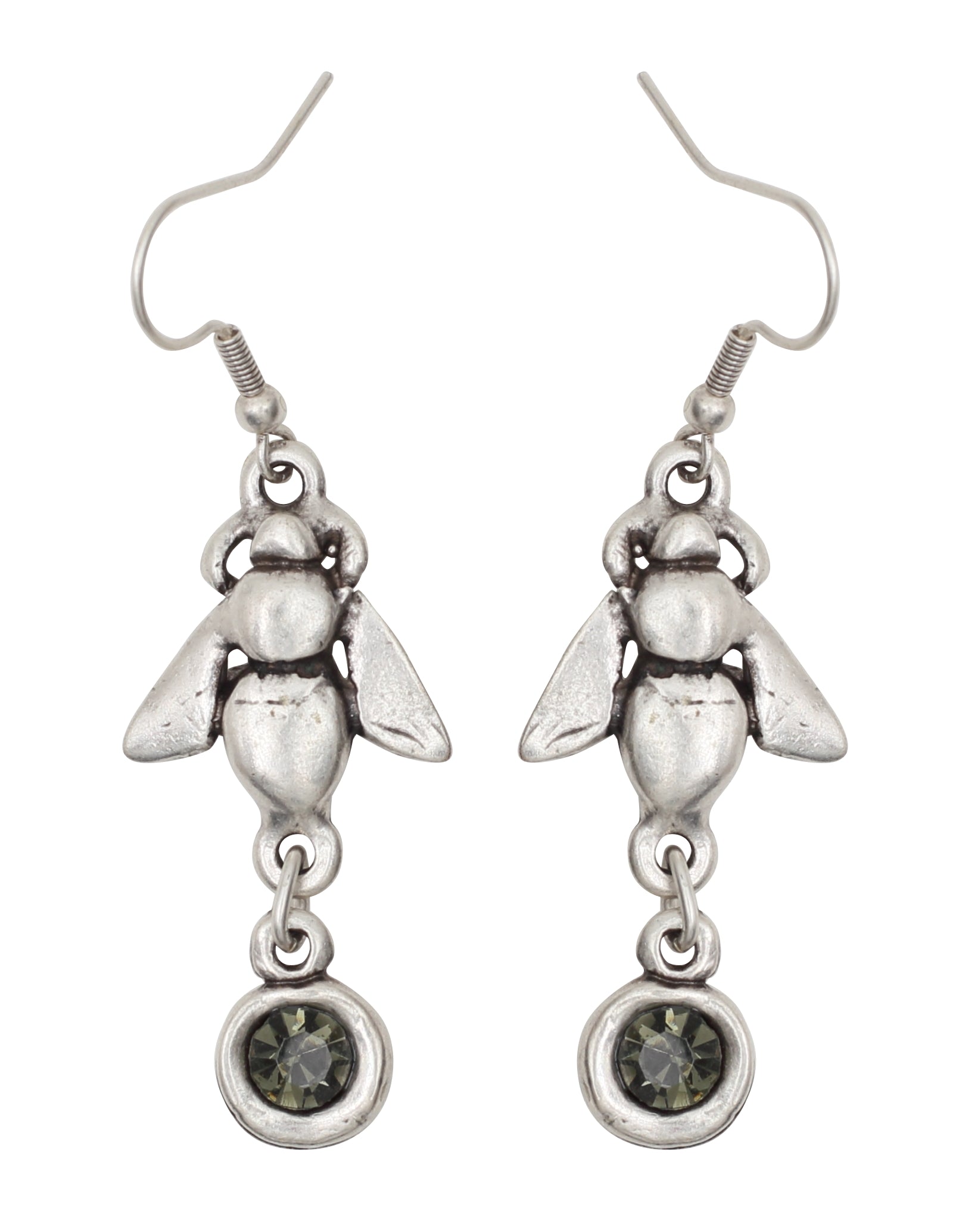 Hand Made Pewter Bee Earrings with Smokey Gray Crystals plated in Silver, Hypoallergenic & Nickel free.
