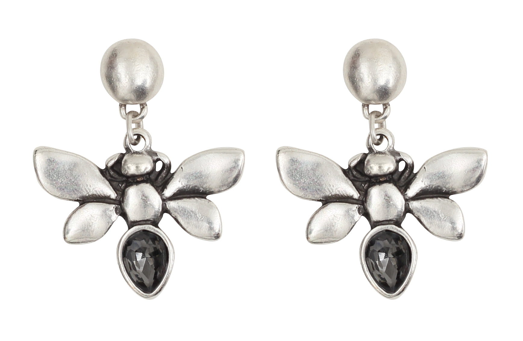 Hand Made Light weight Pewter Butterfly Earrings with Smokey Gray Crystals plated in Silver, Hypoallergenic & Nickel free.
