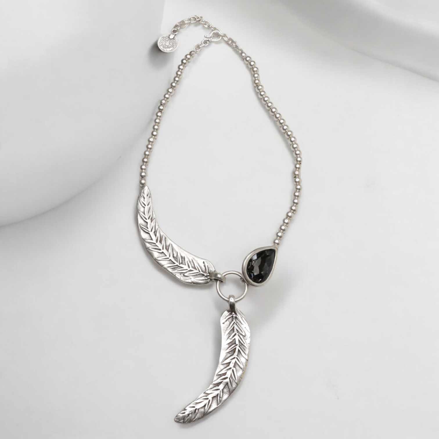 Hand Made Pewter Necklace with Smokey Gray Crystal, Plated in 925 Sterling Silver.