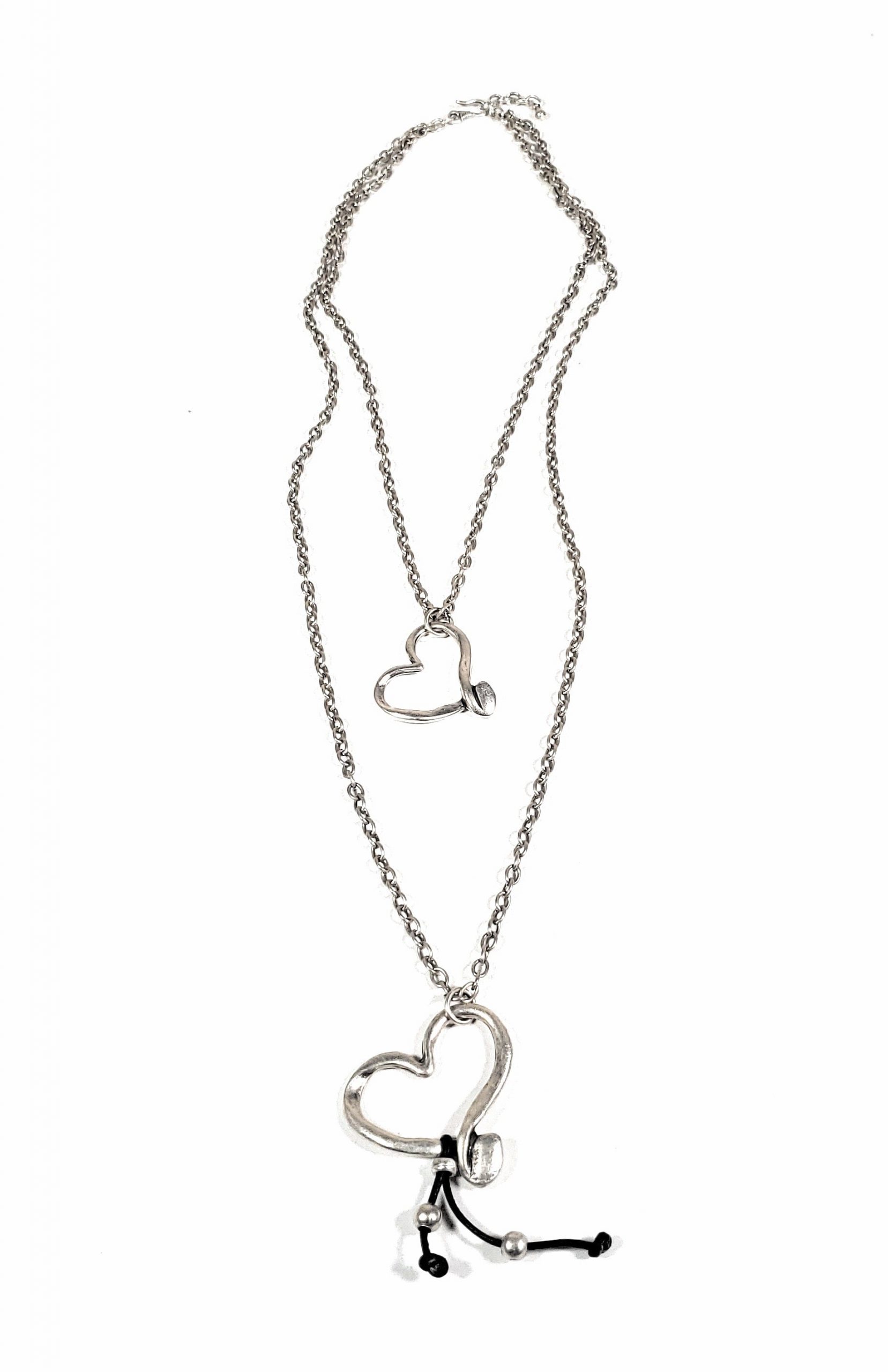 Hand Made Pewter Boho Double Hearth Necklace plated in 925 Silver .