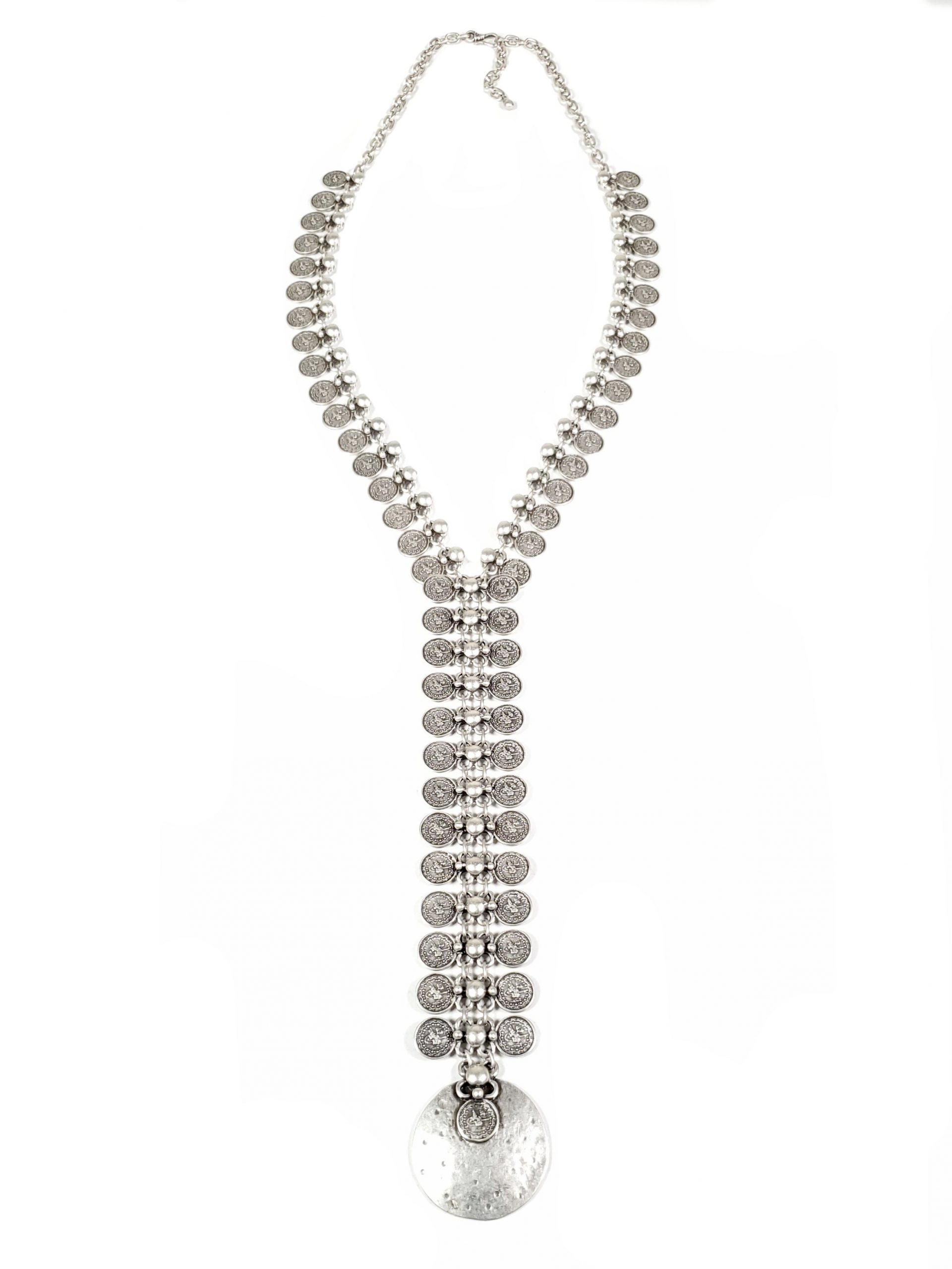 Hand Made Pewter Boho long Coin Necklace plated in 925 Silver .