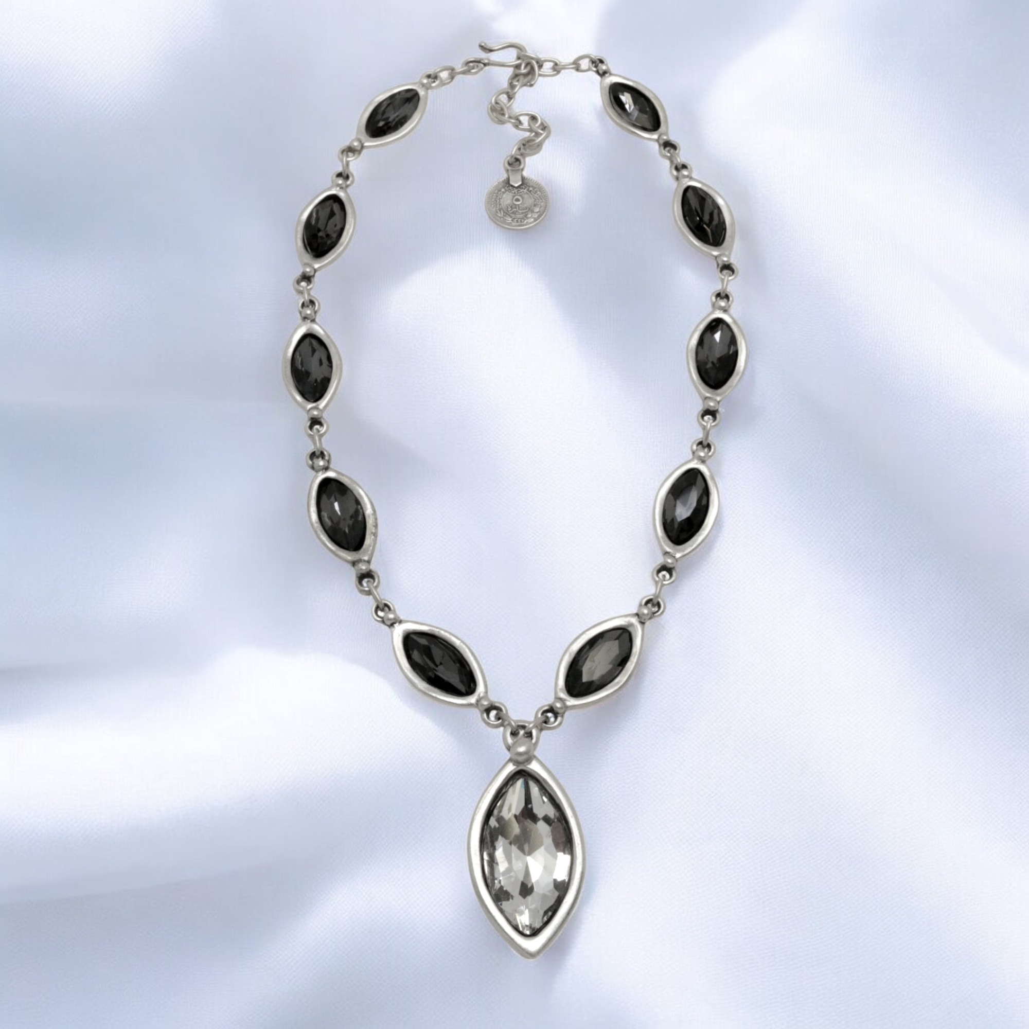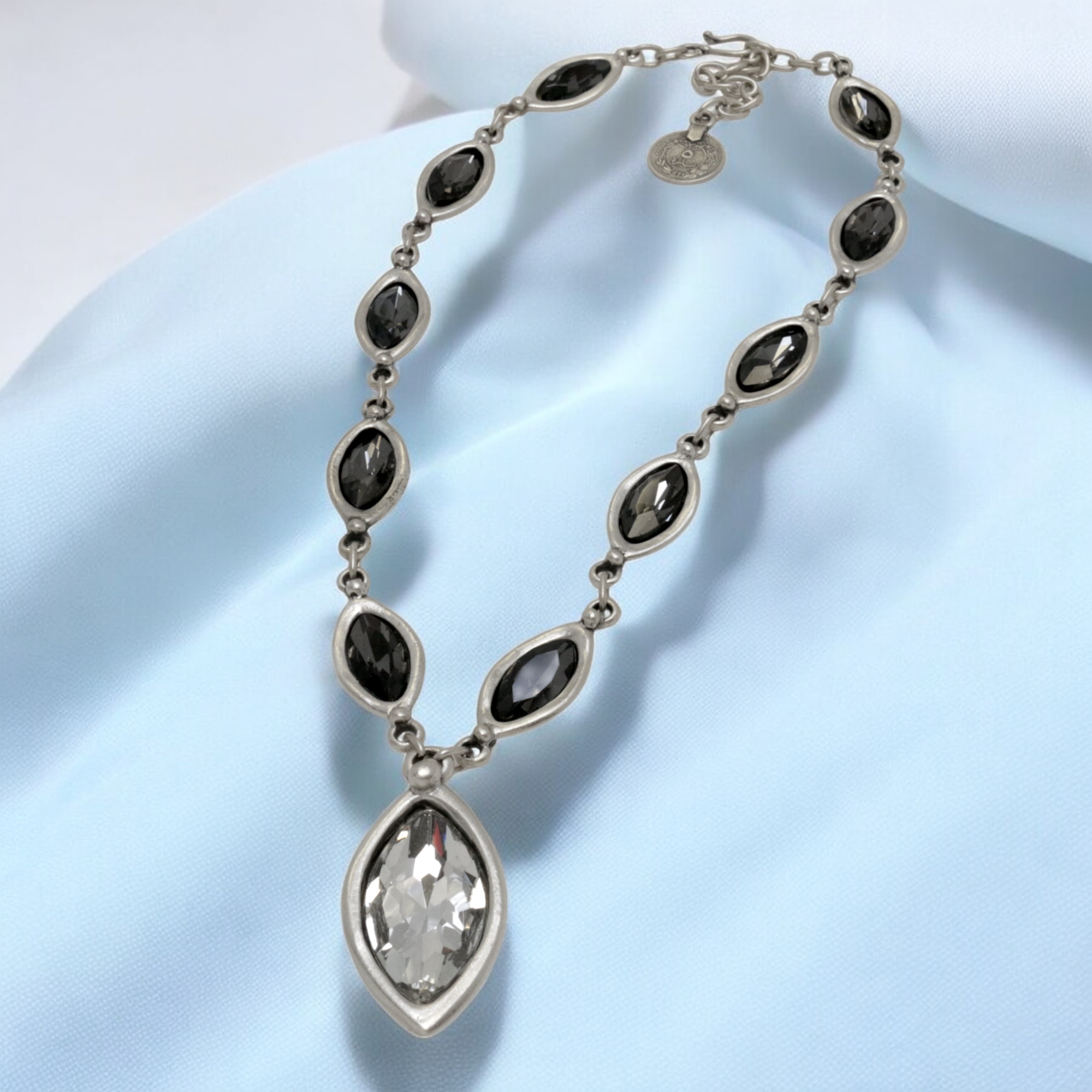 Hand Made Pewter Necklace with clear and Smokey Gray crystals plated in 925 Sterling Silver, Hypoallergenic & Nickel free.