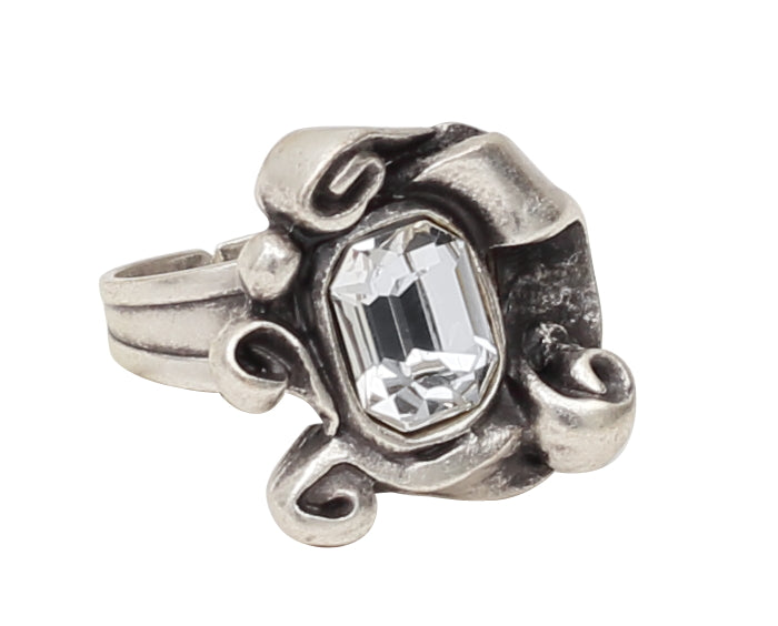 Hand Made Pewter Ring with Clear Crystal plated in Silver, Hypoallergenic & Nickel free. Finger Size adjustable.